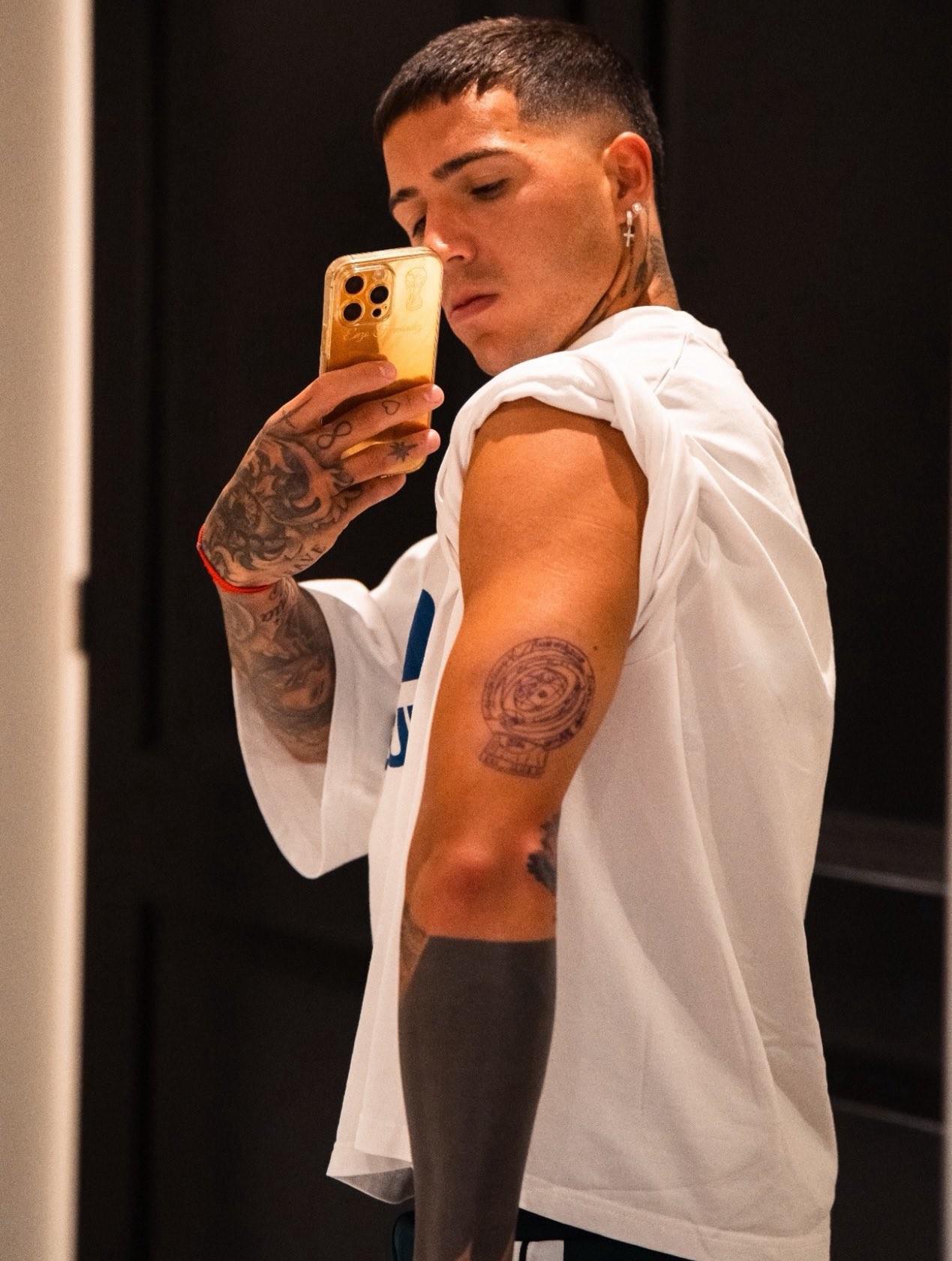 切尔西球员恩佐-费尔南德斯把世俱杯奖杯闻到了自己的左臂上。