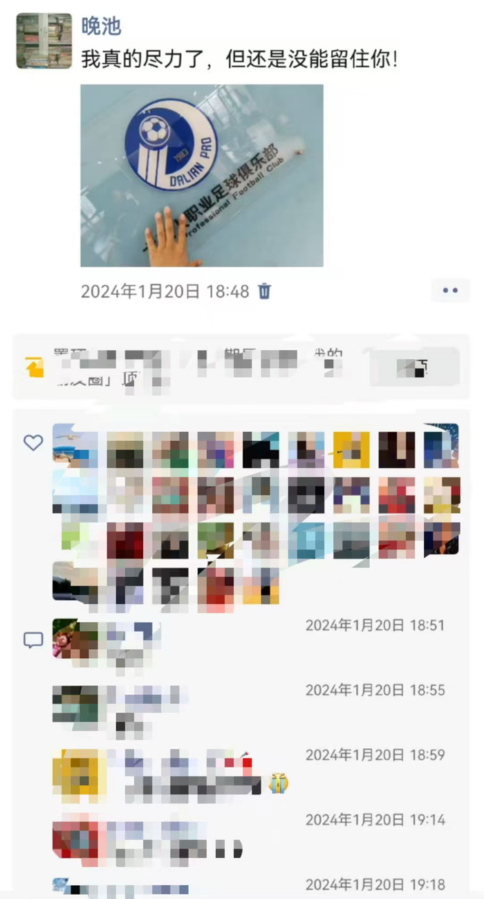 本人2023年12月下旬发的朋友圈,记录着自己为了让大连人队继续活着所做的努力。2023年12月31日,也就是那一年的最后一天,两位兄弟从市内来马桥额与我会面,说相关领导对我和大连球迷的心情十分理解,希望了解一下我的想法和诉求。我说看来大连人队是保不住了,一线队球员星散是我们无法左右的,但我希望能留住这几年深耕青训培养的各年龄段梯队的小球员,如果这些好苗子被抛到市场上,以大连智行(当时还没有更名为大连英博)的财力,根本无法跟各家中超中甲俱乐部竞争。另外,我希望能妥善安置各梯队教练团队和俱乐部工作人员。