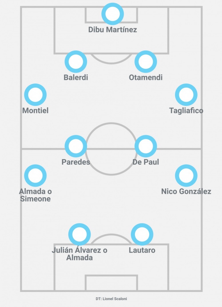 附《奥莱报》预测阿根廷队首发:大马丁;蒙铁尔、巴雷尔迪、奥塔门迪、塔利亚菲科;阿尔马达/小西蒙尼、帕雷德斯、德保罗、尼科-冈萨雷斯;阿尔马达/阿尔瓦雷斯、劳塔罗