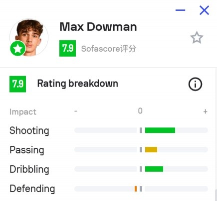 在此之前足总杯对曼斯菲尔德,道曼就给出了很好的数据。比赛半小时计道曼的射门次数(4次)、夺回球权次数(6次)以及在对方禁区内触球次数(6次)均是比赛第一多。赛后也被专业人士夸赞